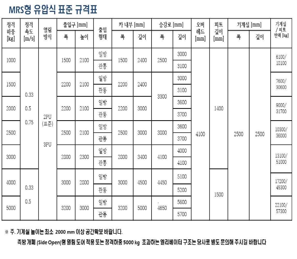 기계실 측면형 화물용 유압식 엘리베이터 표준제원표 (MRS Hydraulic Freight Elevator Table)